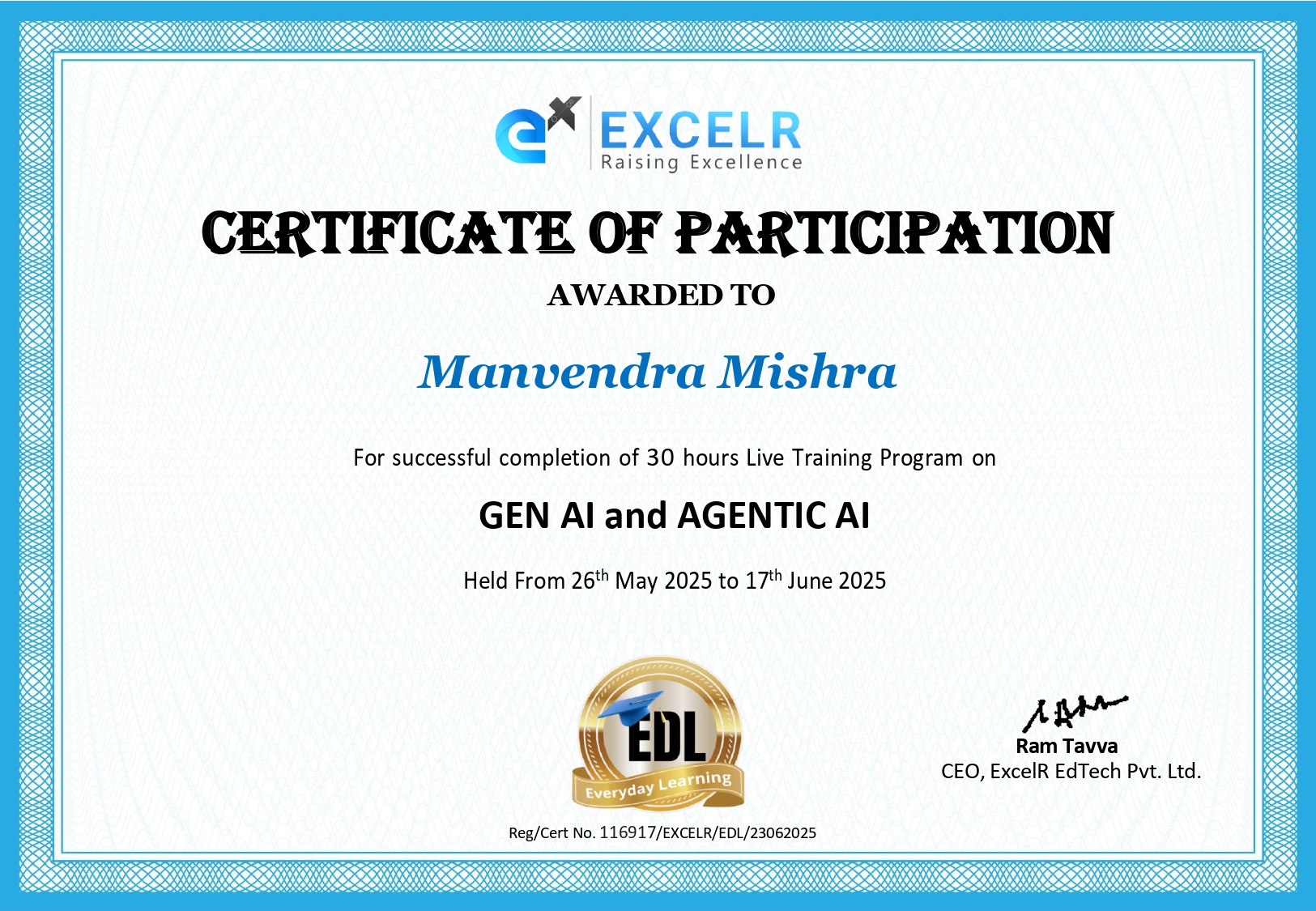 A 30-hour live training program by EXCELR, completed between May 19, 2025, and June 6, 2025.