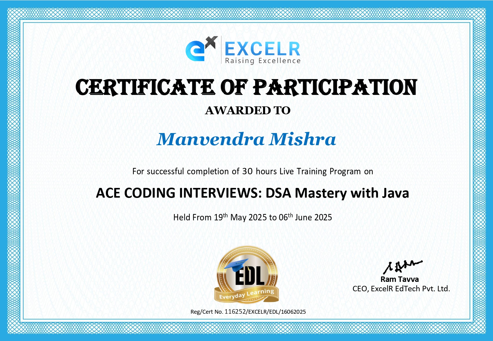 Certificate of Participation in ACE CODING INTERVIEWS: DSA Mastery with Java