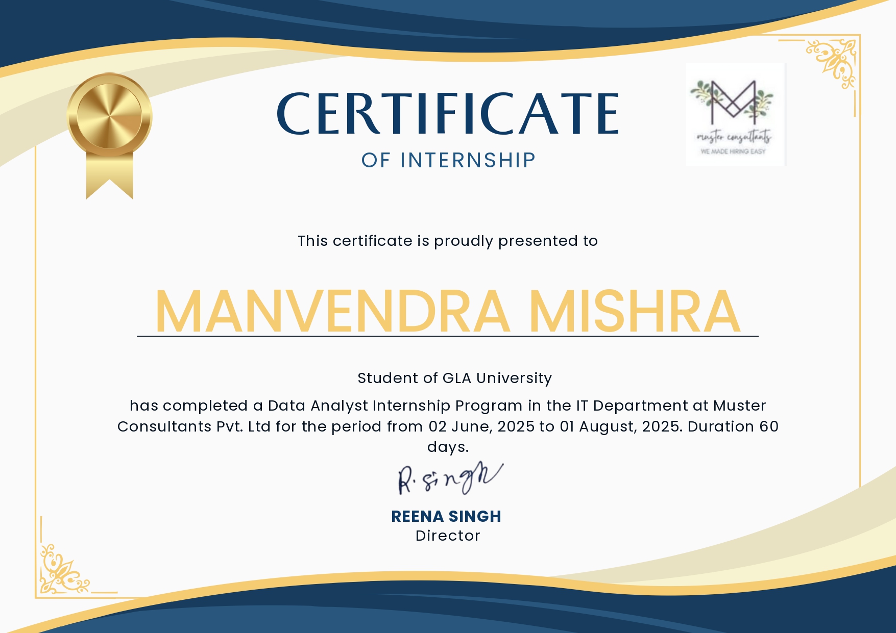 Issued by Muster Consultants Pvt. Ltd for completing a 60-day internship in the IT Department from June 2, 2025, to August 1, 2025