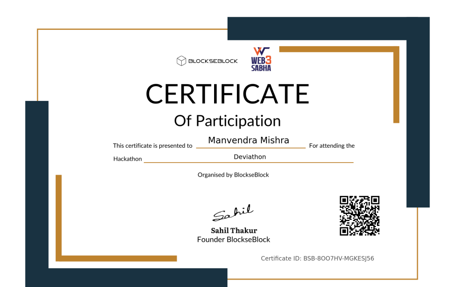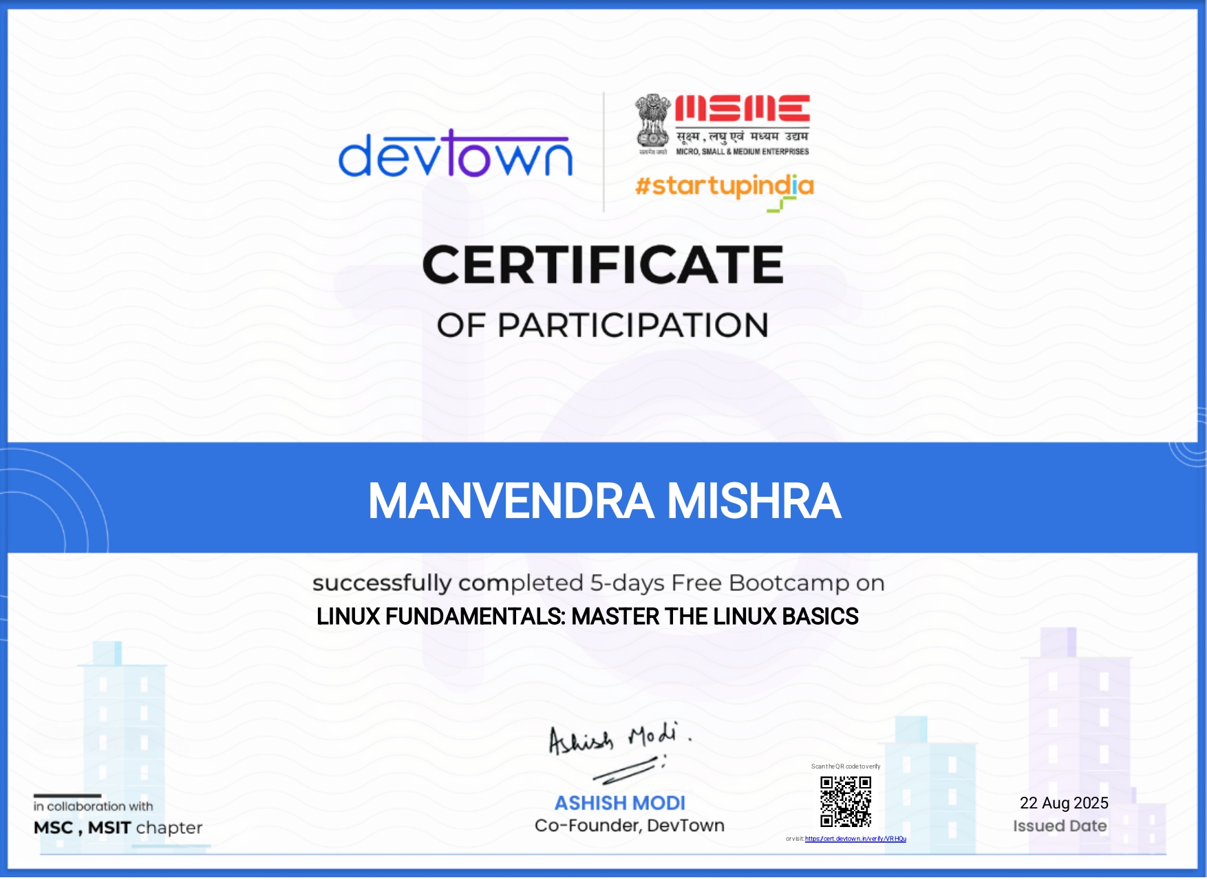 Issued by DevTown for successfully completing a 5-day free bootcamp on "LINUX FUNDAMENTALS: MASTER THE LINUX BASICS" in collaboration with MSME and MSC, MSIT chapter. The certificate was issued on August 22, 2025.