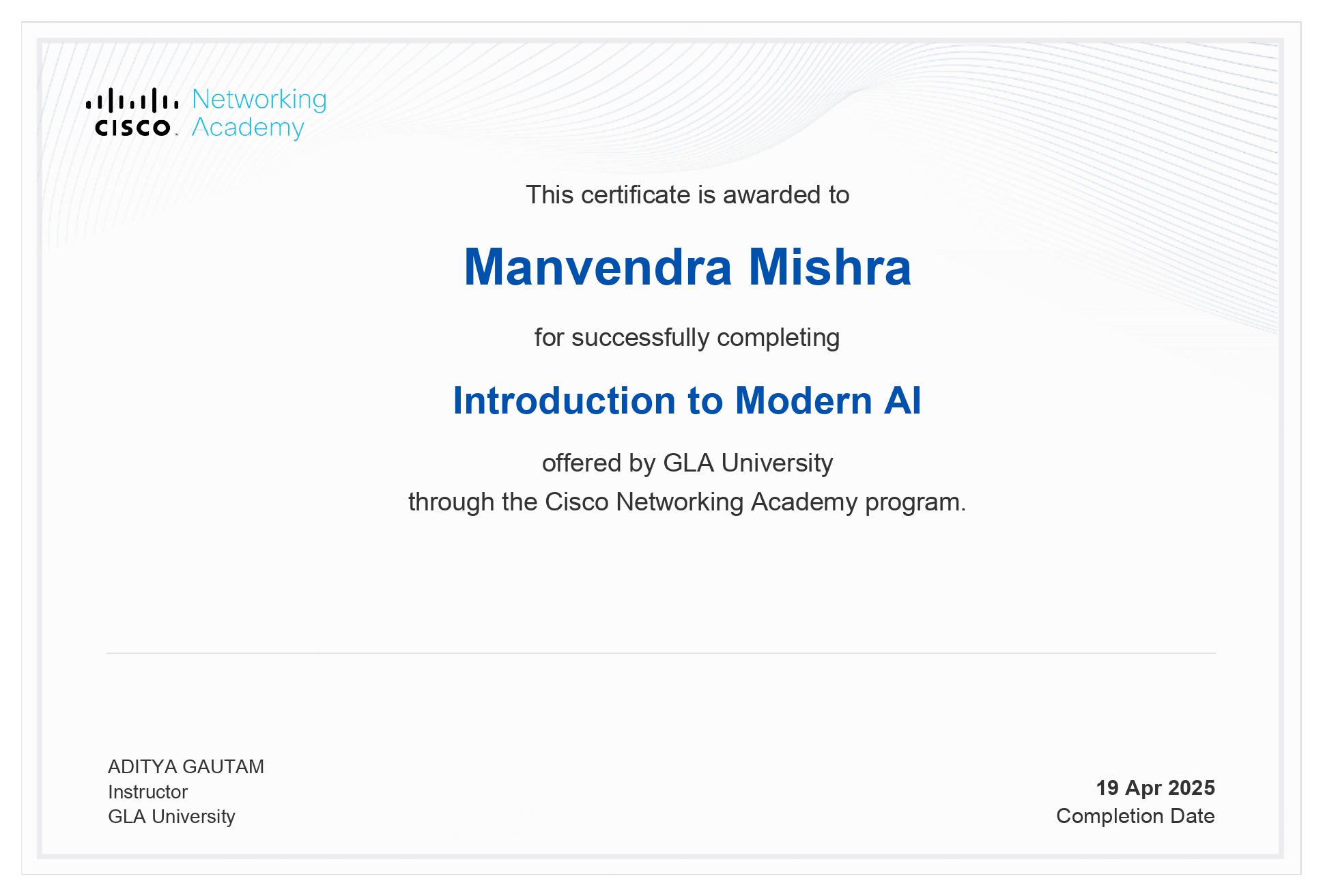 Awarded by Cisco Networking Academy (offered by GLA University) for successful completion of the course on April 19, 2025