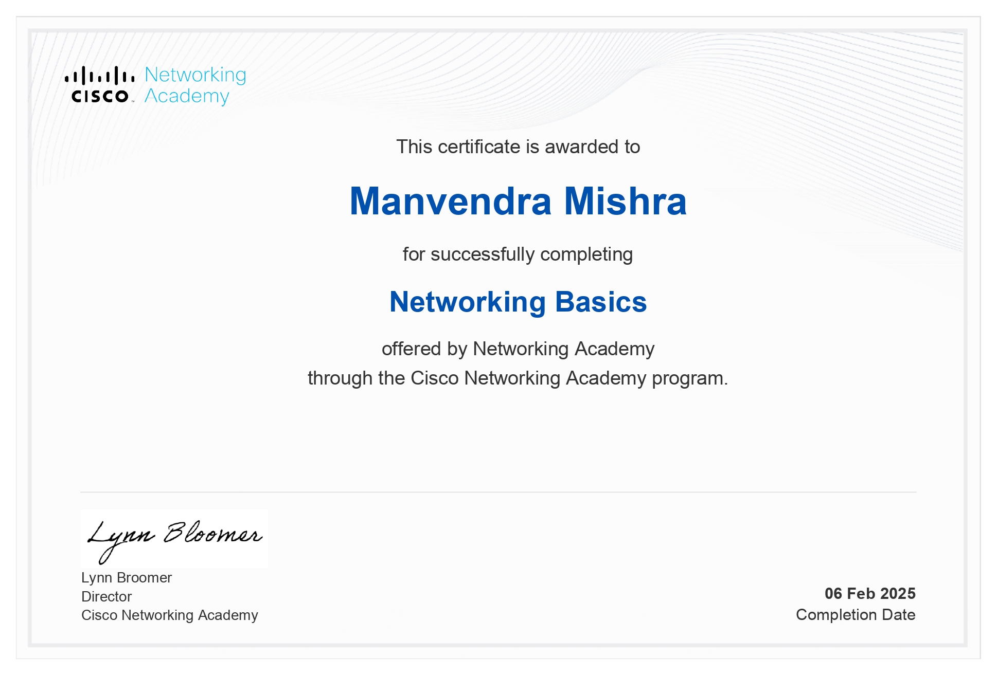 Awarded by Cisco Networking Academy for successful completion of the course on February 6, 2025.