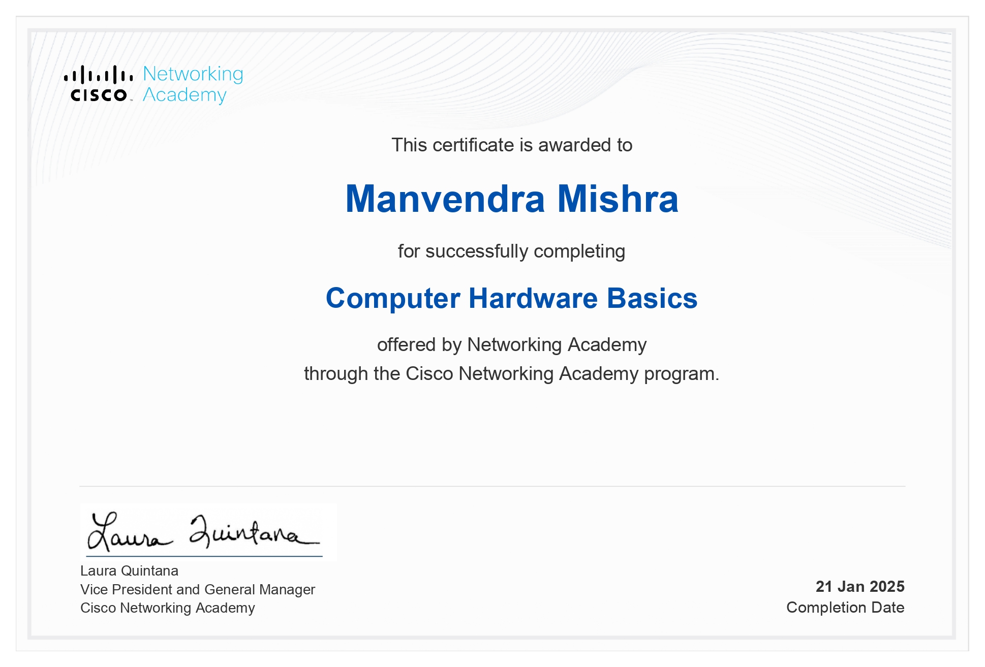 Awarded by Cisco Networking Academy for successful completion of the course on January 21, 2025.